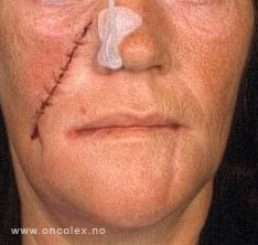 Den aktuelle delen av underkjeven opereres bort, på nivå under tannrøttene. Får man ikke dekket underkjeven ved å sy sammen slimhinnnen, brukes en neseleppelapp til dekking. Det vil si at over- og underhud skjæres fri fra underliggende ansiktsmuskulatur. Man lager et gjennomgående hull i kinnet til munnhulen, og trekker hudlappen igjennom og syr denne til slimhinnekantene. Det kan også brukes en fri lapp fra for eksempel underarmen.