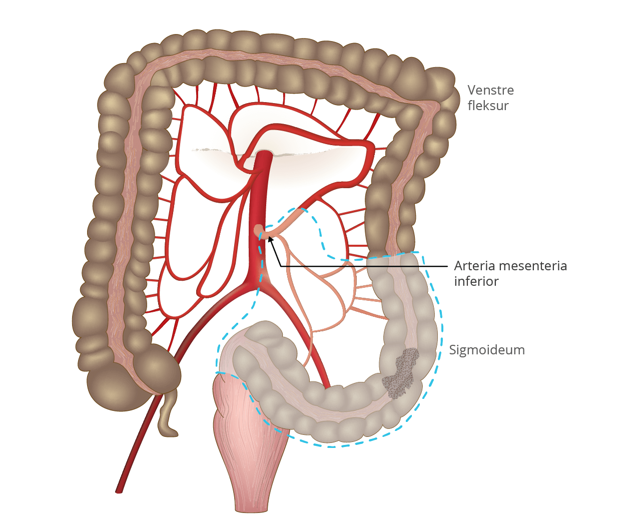 Blodårene (arteria og vena mesenterica inferior) og omgivende lymfeknuter/lymfeårer settes av sentralt, cirka1 cm fra veggen av hovedpulsåren (aorta) som ligger på bakre bukvegg. Man fjerner sigmoideum etter at mesenteriet er fripreparert i korrekt anatomisk plan. Man løsner tarmen omkring venstre fleksur slik at man kan skjøte tarm-endene uten stramning.