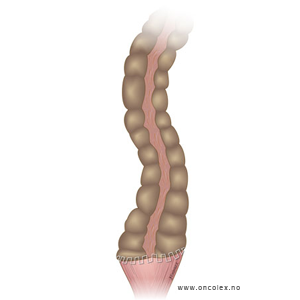- Tarmsegmentet som inneholder svulsten fjernes med minimum 10 cm fri margin til begge sider. Dette er nok i forhold til å fjerne alt kreftvev.