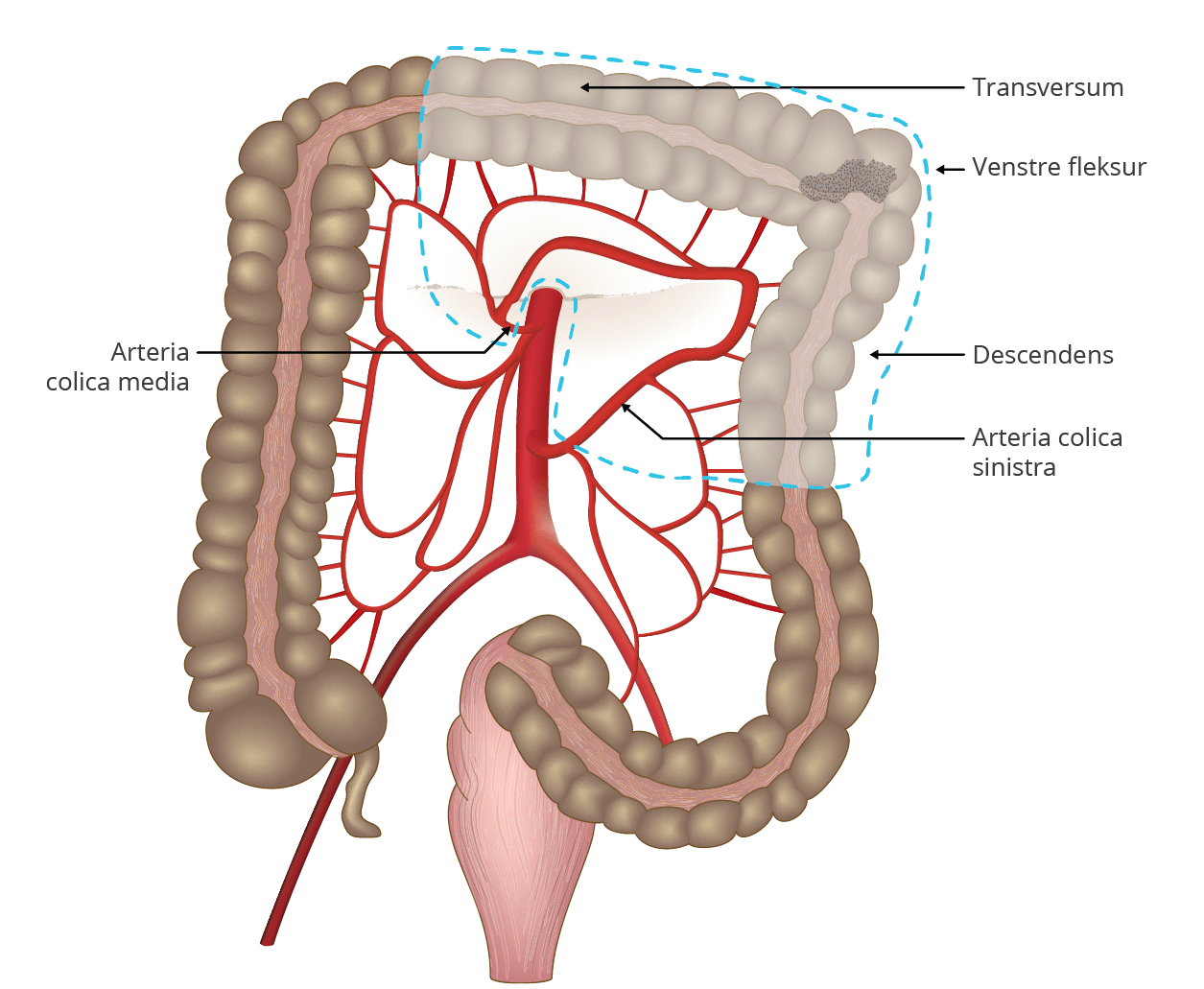 Det har vært anbefalt i Norge å sette av arteria colica sinistra der den avgår fra arteria mesenterica inferior, dessuten å sette av colica media karene sentralt. Andre har hevdet at det ikke er nødvendig å sette av media-karene så sentralt, men at man kan sette av venstre gren av colica media rett etter delingsstedet og beholde høyre gren av colica media. Atter andre mener at man bør individualisere ut fra karanatomien i området. For eksempel er det slik at omtrent 30 % av pasientene har en ekstra arteriegren som går fra arteria colica media og langs nedre kant av bukspyttkjertelen ut til fleksuren, og disse har hyppig metastaser i ymfeknuter sentralt ved art colica media og at karene derfor må settes av sentralt her.
