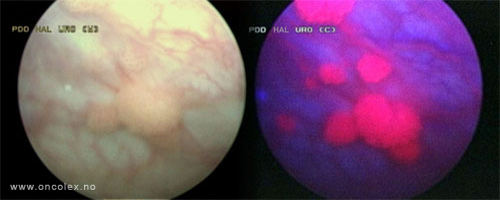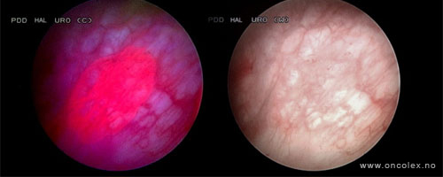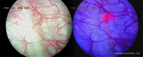 Cirka en time etter blæretømmingen påbegynnes cystoskopi med fluoriserende (blått) lys.