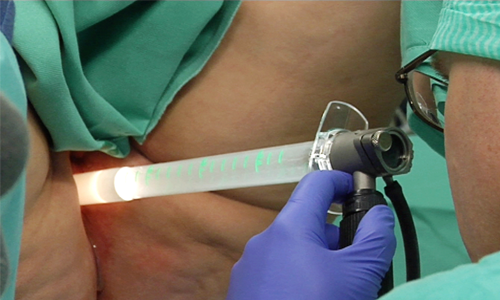 Rektoskopet smøres inn med smøremiddel og føres inn i endetarmen.