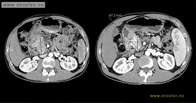 CT-bilder viser effekt etter to enkeltbehandlinger med 177-Lutetiumbehandling på hovedsvulsten i bukspyttkjertelen og en