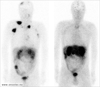 Octreotidscintigrafibilder viser effekt av behandling med 177-Lutetium. Før (venstre) og 1 år etter (høyre). Pasienten sett forfra.