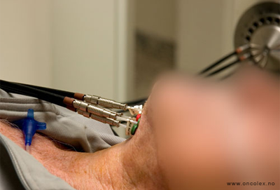 Ved brakyterapi bringes en eller flere radioaktive (iridium) kilder tett inntil eller inn i svulsten. For å sikre bestråling av eventuell mikroskopisk kreft utenfor svulsten, gis brakyterapi alltid kombinert med utvendig strålebehandling. Behandlingen gis som boost av kreft i munngulv og tunge/tungerot.