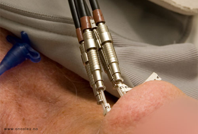 I narkose legges det fire parallelle guidenåler med lik avtand med risikoområdet sentralt plassert i rektangelet som dannes.