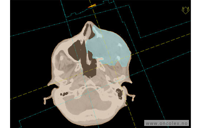Pasienten har masken på når det tas CT. Strålefeltet innstilles basert på CT-bilder av området.