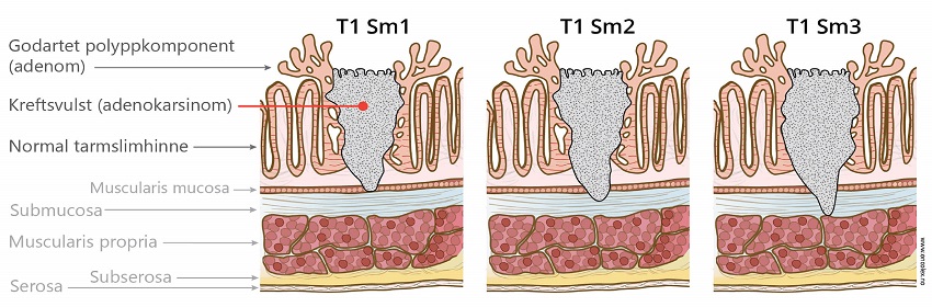 • Tumor infiltrerer ikke dypere enn til øvre/midtre del av submukosa (laget under slimhinnen), Kikuchi stadium T1 sm1–2 (Ikke konsensus om T1sm3).